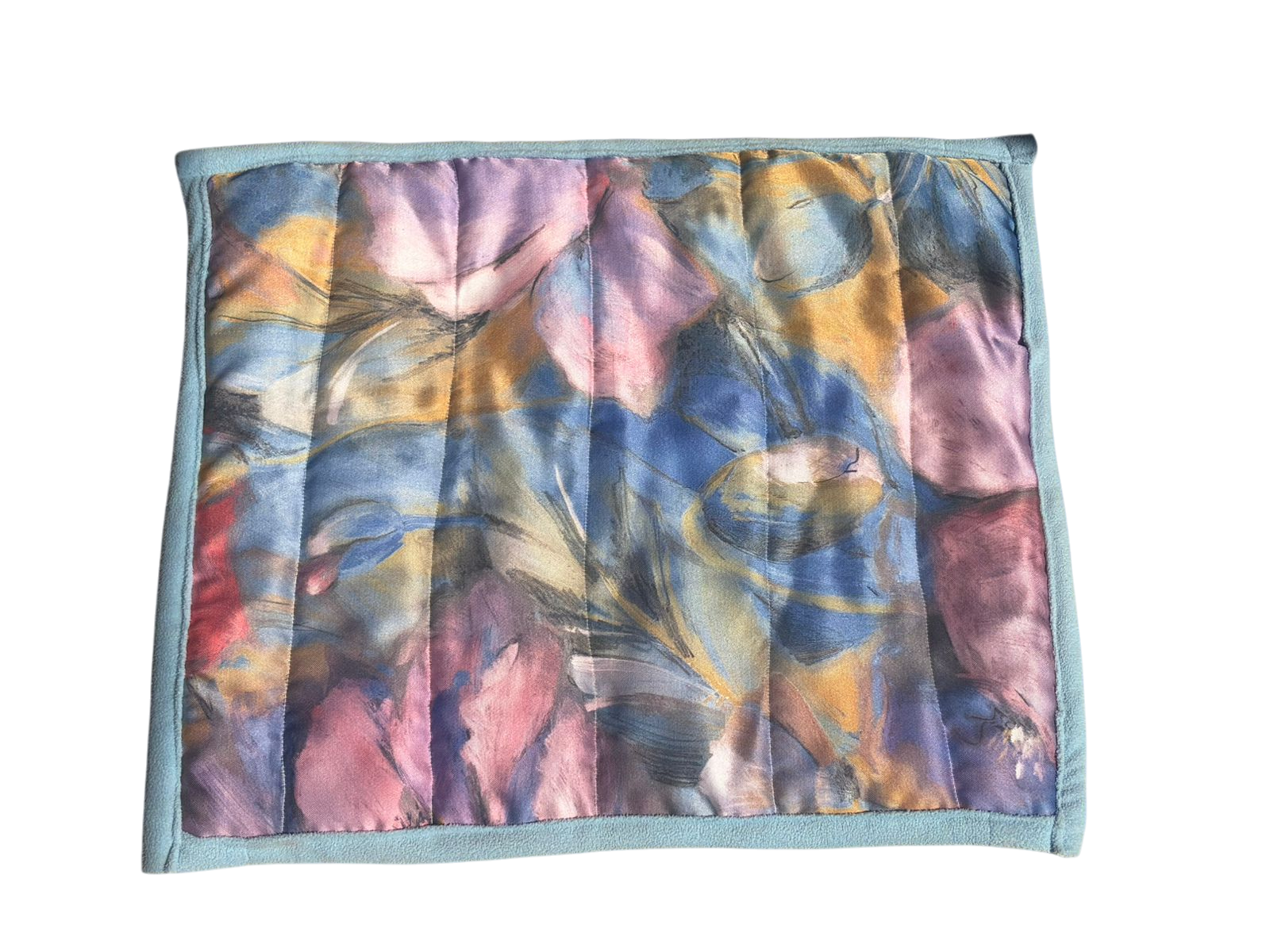 Bajada de baño color celeste-fucsia. Dimensiones: 55 cm x 43 cm. Tela de buzo cálida y antideslizante.