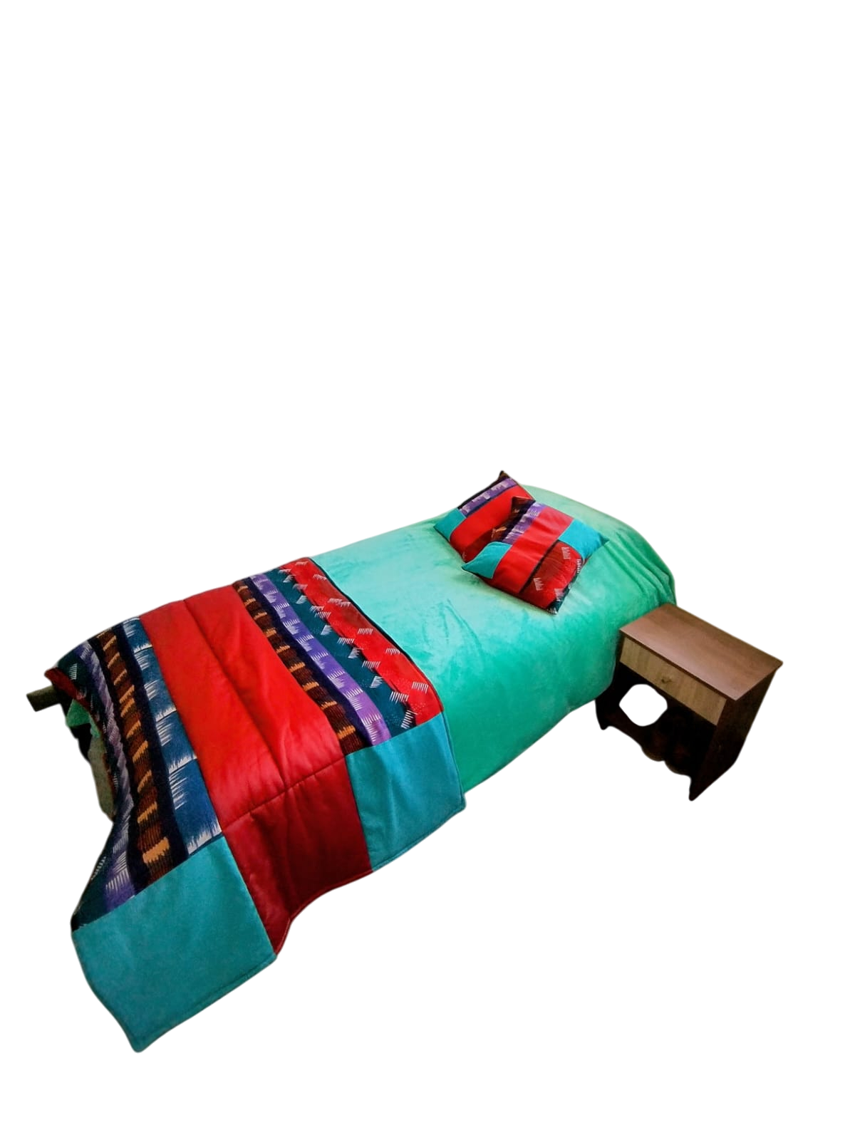 Confeccionados con telas rescatadas de camisas y pantalones de vestir; esta piecera y sus cojines son ideales para dar un nuevo aire al dormitorio.Color: Azul-verde-rojo colonialDimensiones Piecera: 100×126 cmDimensiones Cojines: 40×40 cm