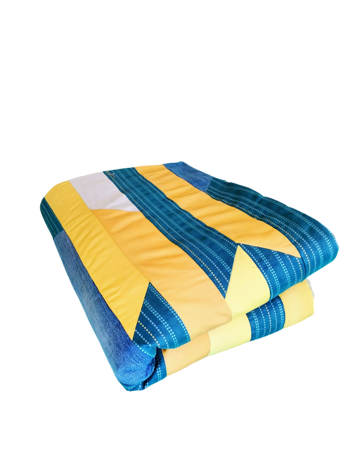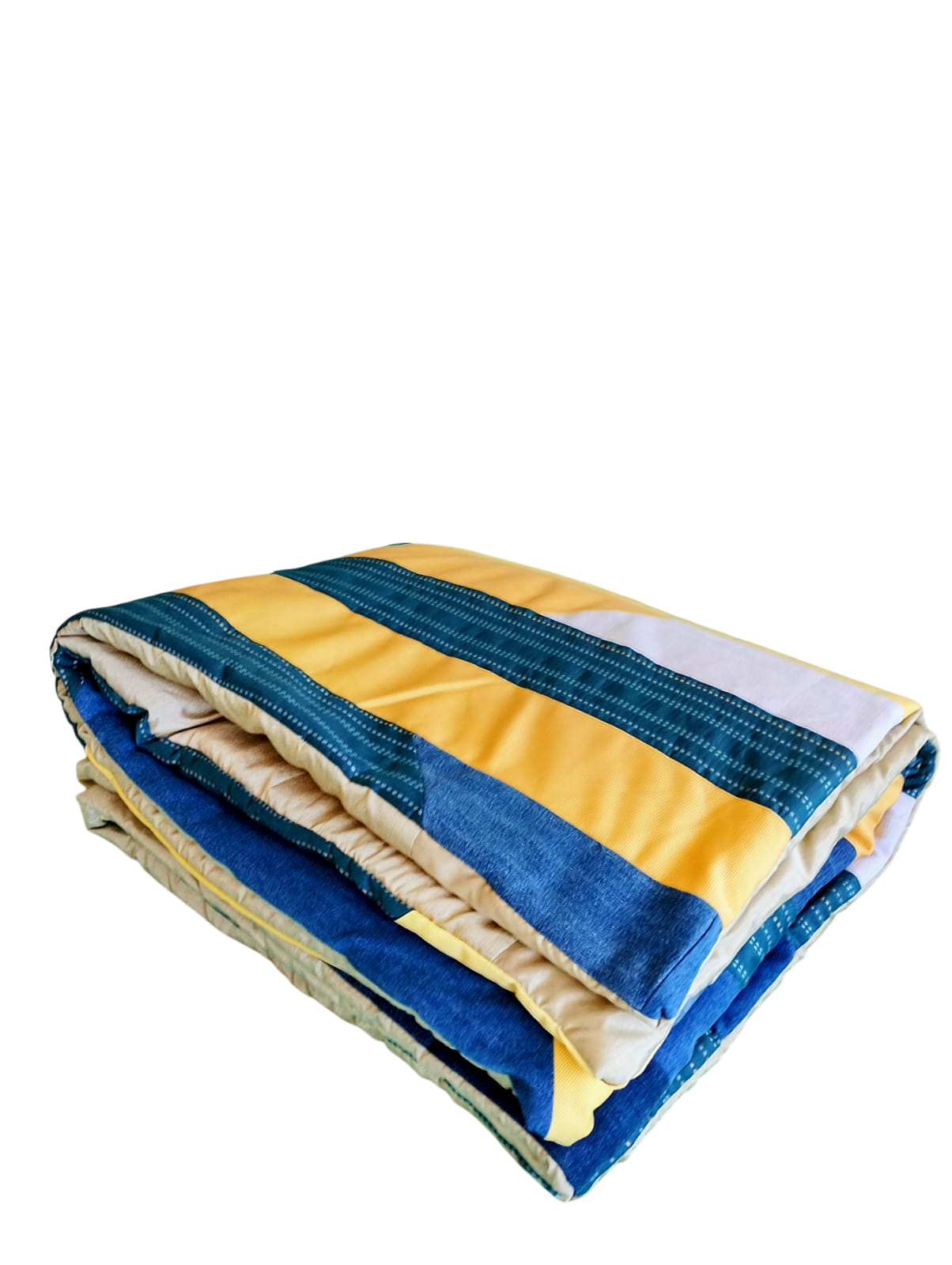 Confeccionados con telas rescatadas de jeans y pantalones de vestir, esta piecera calza perfectamente tanto en una cama de dos plazas como en una cama King. Este conjunto contrasta el corte vertical y diagonal junto con el contraste de color amarillos-azules.Color: Azul-amarilloDimensiones Piecera: 100×260 cmDimensiones Cojines: 45×45 cm